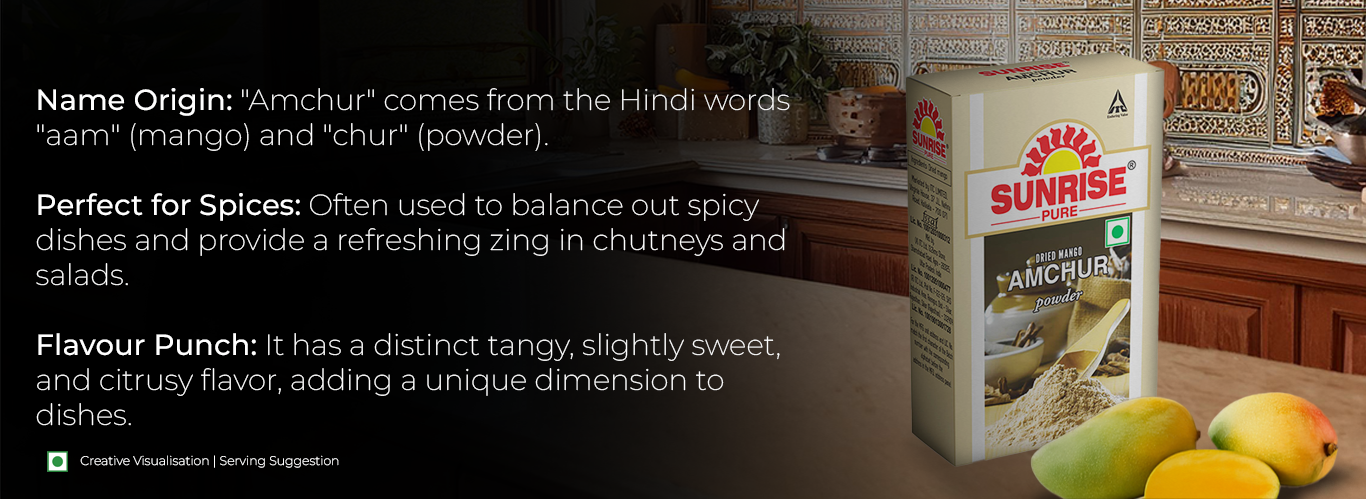 Sunrise Amchur Powder extends Bengal's enduring love for mangoes beyond the ripe fruit to become a kitchen staple. This rustic, tasteful spice adds tangy brilliance and a signature citrusy aroma to both savoury and sweet dishes, enhancing flavours with its distinctive zest.