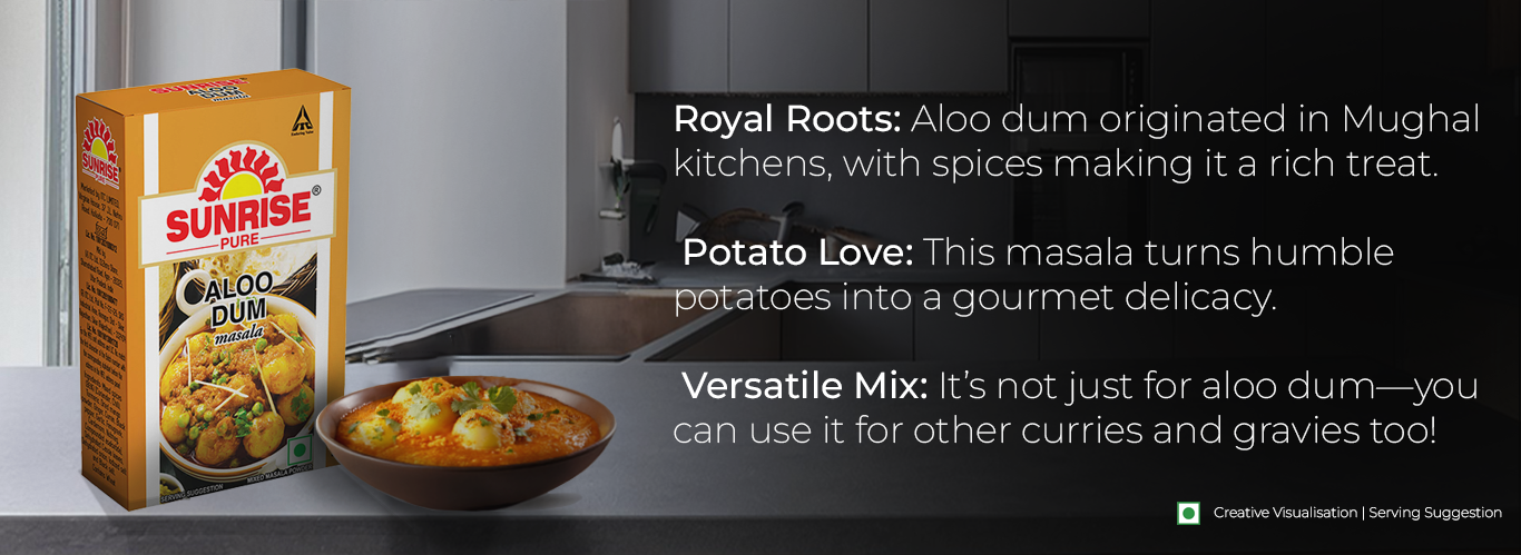 Sunrise Aloo Dum Masala combines traditional spices with distinctive flavour profiles to offer a signature brilliance to your unique aloo dum recipes. A spice blend that suits the Indian palate, this dum aloo masala ensures each bite celebrates rich, aromatic indulgence. Rediscover the magic of home-cooked meals with Sunrise.