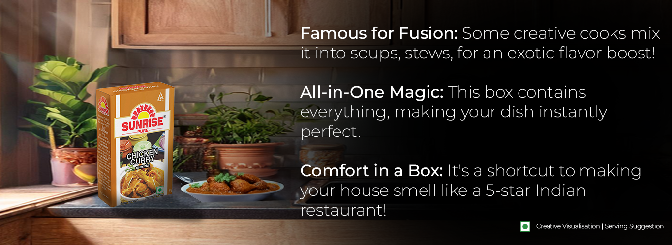 Sunrise Chicken Curry Masala embodies the essence of home-cooked comfort with its meticulously crafted blend of spices that infuse every dish with depth and richness. Our select assortment of spices unlocks a symphony of flavours, allowing for versatile preparations of chicken curry. With every bite, memories, family recipes, and cherished culinary traditions come alive, enveloping you in warmth.