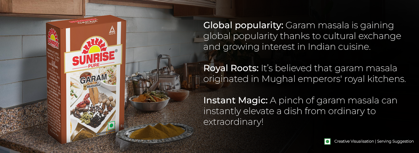 Sunrise Garam Masala embodies the deep, soulful connection every Bangalee feels with this essential spice blend. Revered in every household, this garam masala powder is a kitchen staple that brings warmth and heart to any dish. Each garam masala packet from Sunrise promises a symphony of flavours, securing its place in the culinary traditions of Bengal.