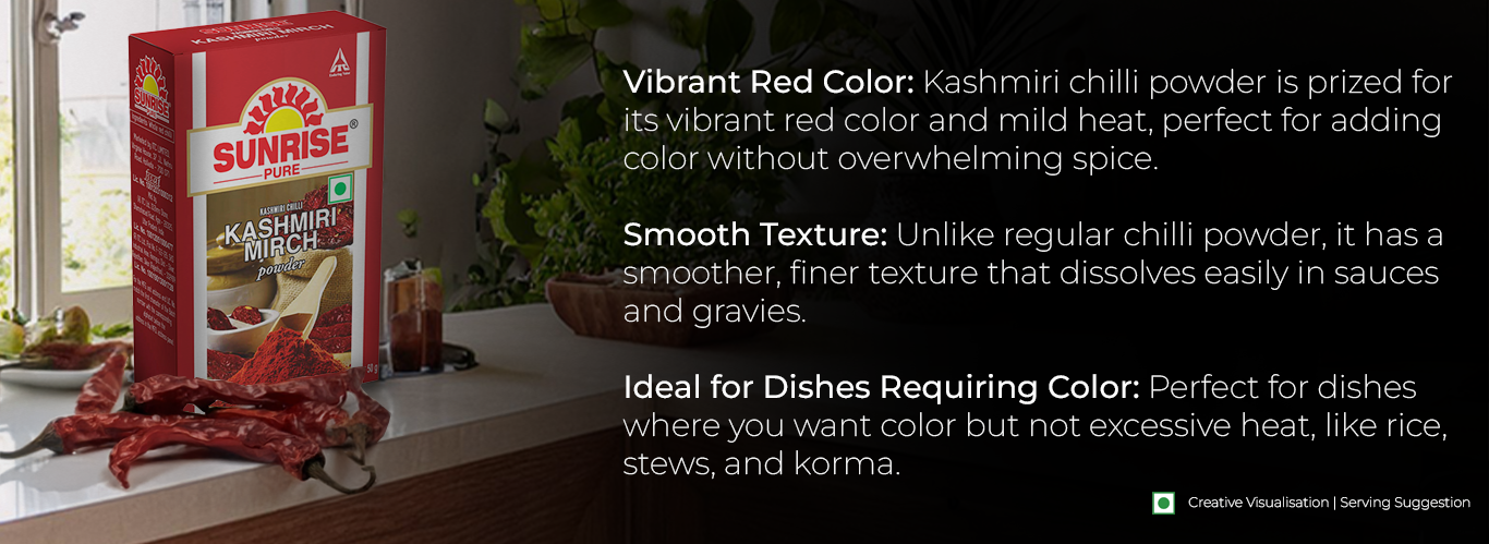 Sunrise Kashmiri Lal Mirch, also known as Kashmiri red chilli powder, adds vibrant colour and mild heat to dishes. Renowned for its deep red hue and slightly smoky flavour, this chilli powder enhances the visual appeal and taste of curries, marinades, and other recipes without overpowering the dish with excessive spiciness.