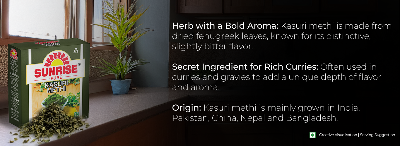 Sunrise Kasuri Methi adds a rich, slightly bitter, and nutty aroma to dals, curries, and parathas. These sun-dried fenugreek leaves are hand-crushed for maximum flavour. A little goes a long way in elevating North Indian classics.