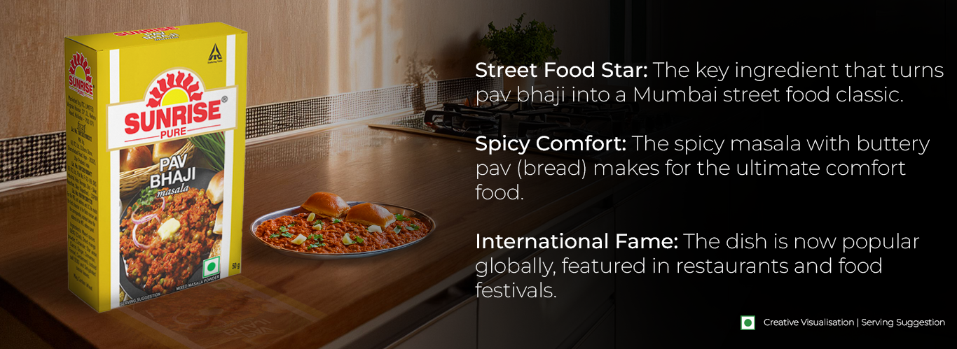 Sunrise Pav Bhaji Masala is a spice blend that captures the authentic flavours of our famous street food, pav bhaji. This masala powder combines a unique mix of spices to create a rich, flavorful gravy that pairs perfectly with buttered pav (bread rolls). Just add this masala to your bhaji (vegetable mix) for a mouthwatering pav bhaji experience that's sure to impress.
