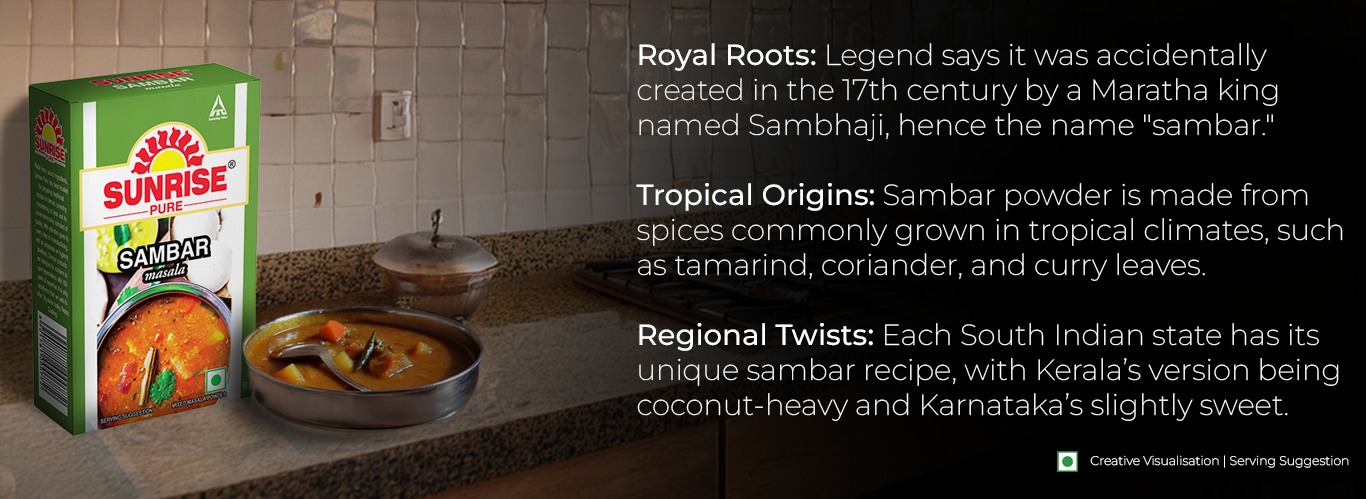 Sunrise Sambar Masala brings the authentic taste of South India home. A curated mix of roasted spices, lentils, and chillies, it gives your sambar the perfect tangy-spicy depth. Great with idli, dosa, or rice for a wholesome, comforting meal.
