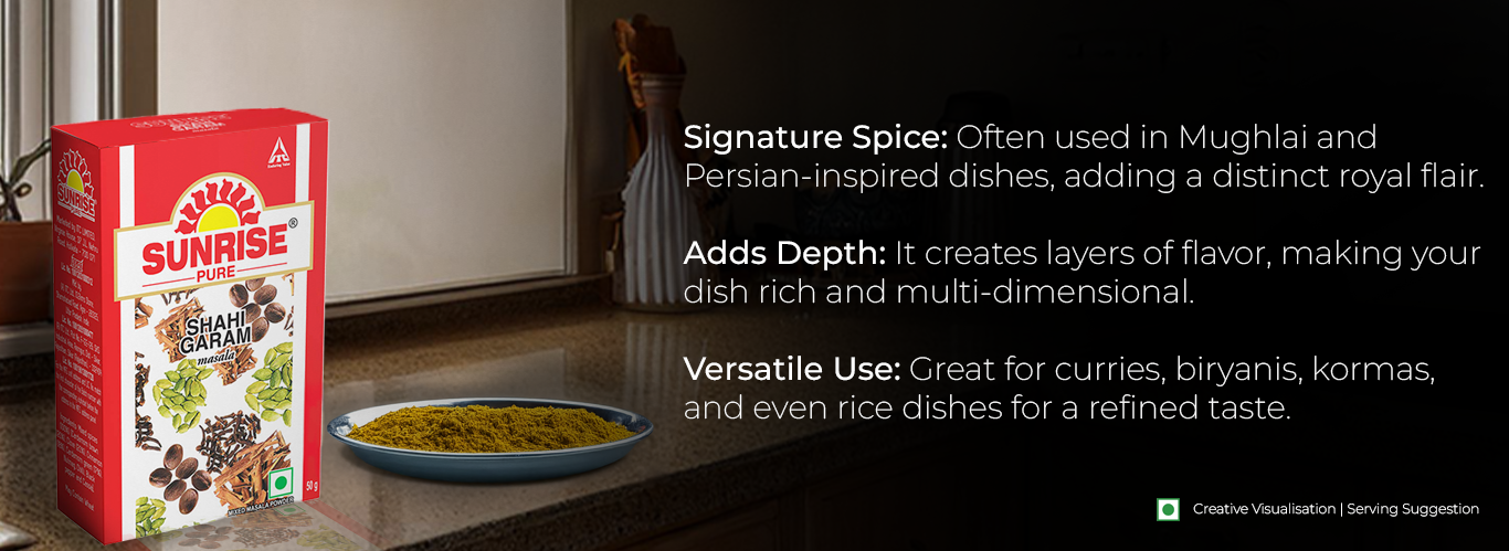 Sunrise Shahi Garam Masala is a royal blend of aromatic spices like cardamom, cinnamon, clove, and nutmeg. It adds rich, warm flavour to biryanis, kormas, and festive dishes. A finishing touch that brings regal depth to every special recipe.