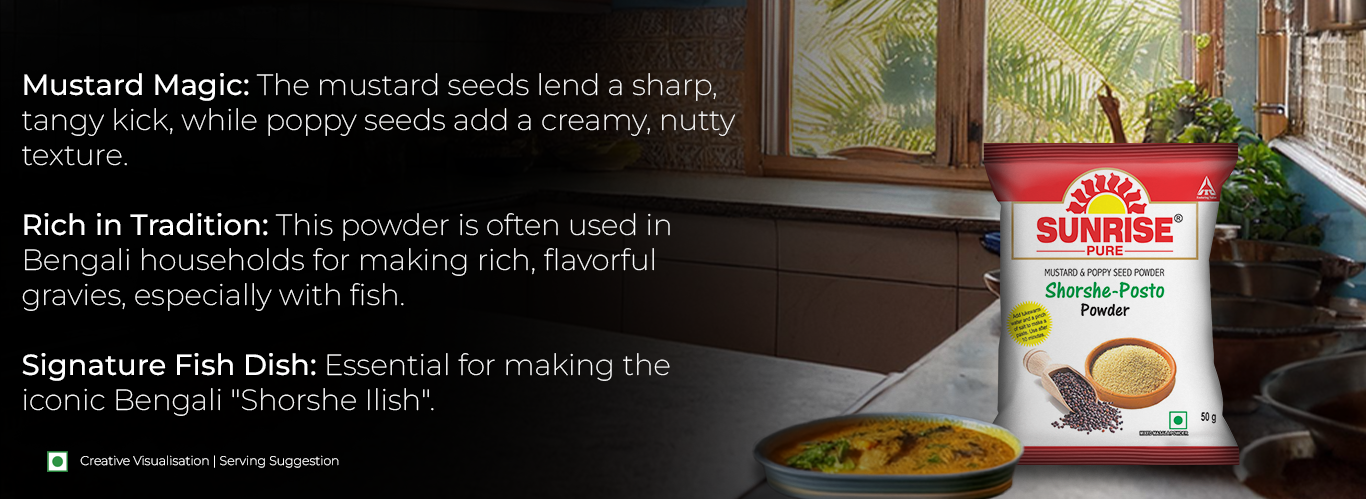 Sunrise Shorshe Posto Powder combines mustard and poppy seeds—two classic Bengali Flavors. Perfect for jhols and bhartas, it lends creamy texture and bold mustardy heat. This blend brings the essence of Bengali home kitchens straight to your plate.