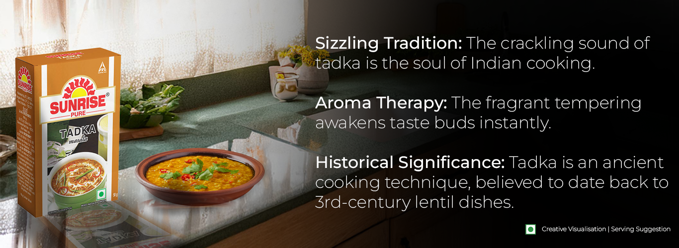 Sunrise Tadka Masala enhances dals and curries with its perfectly roasted, flavour-packed blend. Add it to hot ghee or oil to release its full aroma. It gives instant depth and spice to dishes needing that extra "tadka" punch.