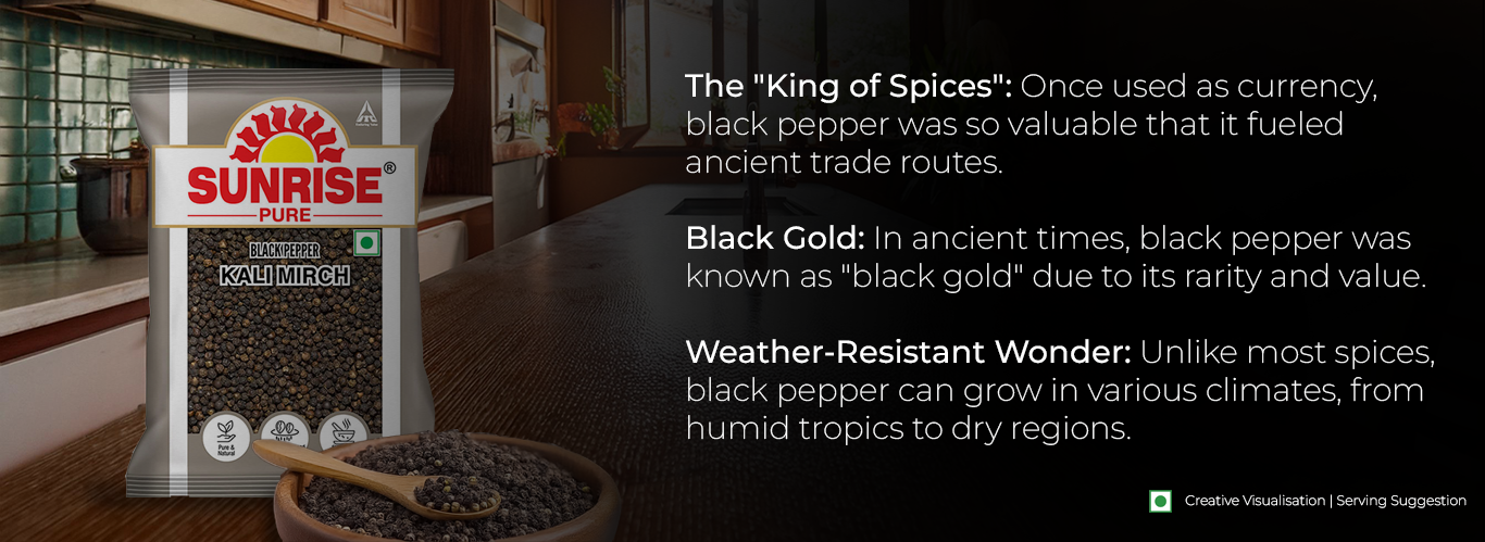 Sunrise Black Pepper Whole is revered for its punchy pungency and distinctive flavour. Also known as "Kali Mirch," aromatic black peppercorns carry memories of comforting family meals. A staple in every household, its sharp aroma and intense warmth infuse dishes with a sense of nostalgia and timeless tradition.
